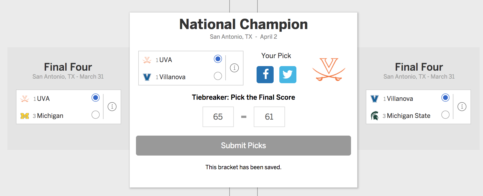 Every year since 2010 I have used data science to predict the results of the NCAA Men’s Basketball Tournament. In this post I will describe the methodology that I used to create my picks (full bracket here). The model has Virginia, Michigan, Villanova, and Michigan State in the Final Four with Virginia defeating Villanova in the championship game: