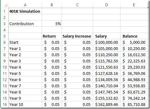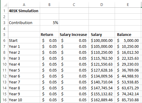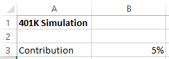 First, let’s build a worksheet that calculates 401k balances for 10 years. At the top of the worksheet let’s enter a yearly contribution rate: