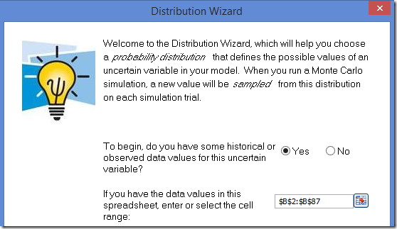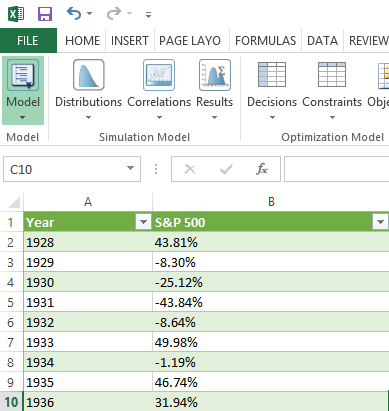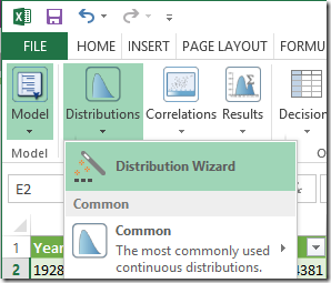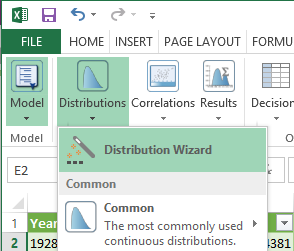 Now let’s turn this historical data into a probability distribution we can use in our model. Select the S&P 500 historical return data and select Distibutions –> Distribution Wizard in the Analytic Solver Platform tab: