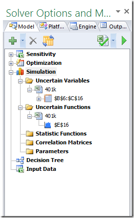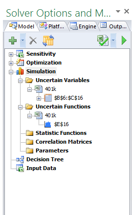 The last thing we need to do is to define an “output” for the simulation, called an Uncertain Function. When we define Uncertain Functions, we get nice charts and stats for these cells when we run a simulation. Click on the Balance entry for Year 10, then click on arrow next to the “+” in the Model Pane, and then Add Uncertain Function. Your Model Pane will look something like this:
