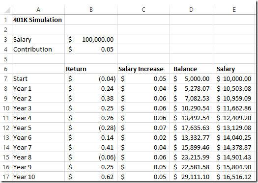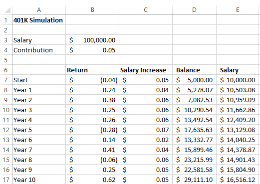 - Balance = E6*(1 + B6)+D6*$B$3. There are two terms. The first is the old balance times the portfolio return. The second is the current salary times the contribution rate.