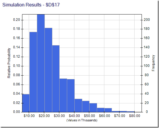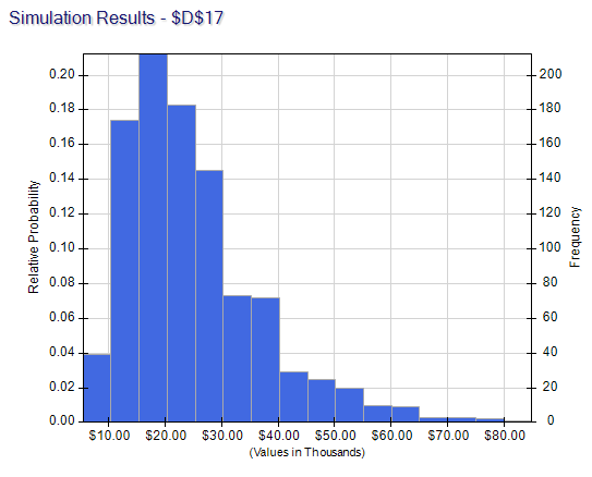 Now all we need to do is click Simulate in the ribbon. Analytic Solver Platform draws samples for the uncertain variables (and evaluates everything in parallel for fast performance) and then shows you a chart showing the different possible 401k balances. As you can see, the possible balances vary widely but are concentrated around $100,000: