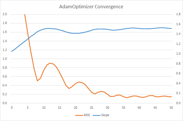 Let’s explain briefly how the optimization works. A single call to the Optimizer does not adjust variables all the way to their optimal values; a call represents a single step towards an optimum. If you want to learn more about the specific logic that AdamOptimizer uses during a step, look at the TensorFlow documentation, or if you are ambitious, read the paper. The key ingredient is the gradient of the variables that you are trying to optimize. TensorFlow computes gradients by creating computational graph elements for the gradient expressions and evaluating them – have a look at this stackoverflow response for details. Again, TensorFlow can do this because it has a symbolic representation of the expressions you’re trying to compute (it’s in the picture above). Since a call to an optimizer is a single step, Session.run() must be called repeatedly in a loop to get suitable values. In the picture below I have plotted the values of the error (MSE) and m (Slope) expressions for the first 50 steps.