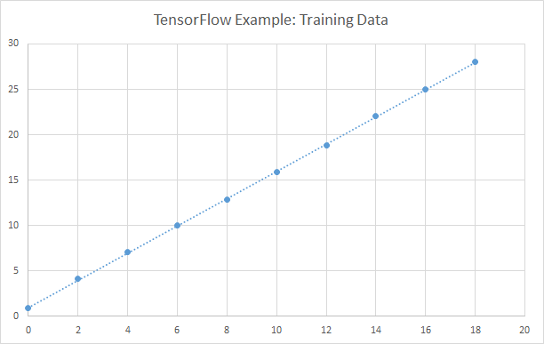 This model will fit a line y = m * x + b to a series of points (x_i, y_i). This code is not the best way fit a line – it’s just an example. In our code, we’ll generate points with small random deviations from a line with known slope and intercept. Our test will be to see if we can recover these known values using TensorFlow. Here is a picture of our training data: