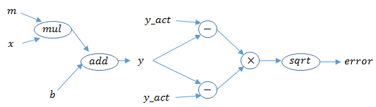 Now that we have a model for our predicted values y, we want to compute the sum of squared error. This is accomplished using Tensor arithmetic and tf.sqrt. Here is a picture of our computational graph to this point: