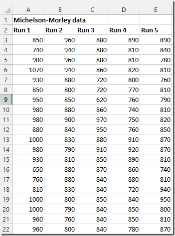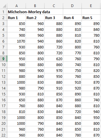 You’ll need to start with a table containing the data you want to plot. I am using the data from the Michelson-Morley experiment: