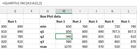 Create another table with the following rows for each series: min, q1, q2, q3, max. These will be the primary data in your box plot. Min and max are easy – use the =MIN() and =MAX() formulas on each data series (represented as columns A – E in my example). To compute Q1-Q3 use the QUARTILE.INC() function. (INC means “inclusive”. QUARTILE.EXC() would work fine if that’s what you want.) Enter the formulas for the first series and then “fill right”: