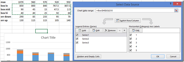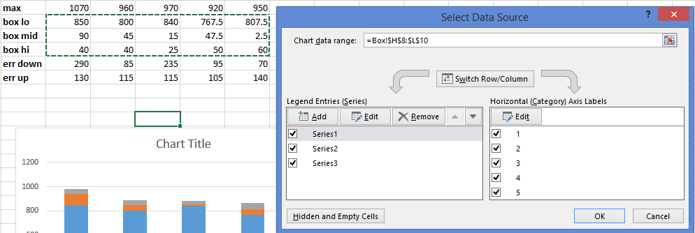 Now right click on the blank chart, choose Select Data Range and select the “box lo, box mid, mix hi range” as your data: