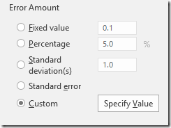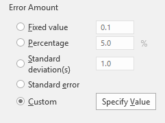 Follow the steps in my celebrated “Add Error Bars” post. Click on the “+” next to the chart, select Error Bars. Choose Series 2 (which corresponds to the median). Click on “More options” in the Error Bars flyout menu next to the “+”. In the task pane on the right, for Error Amount choose Custom and then click the Specify Value button: