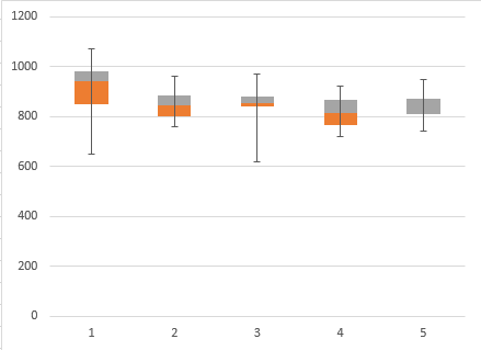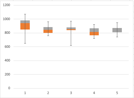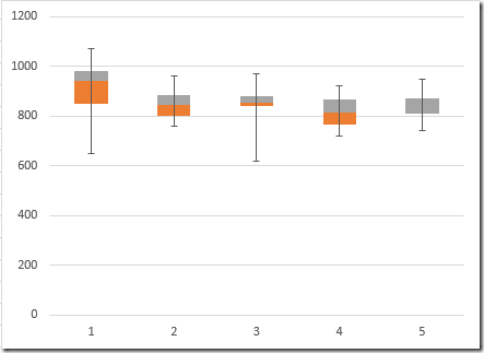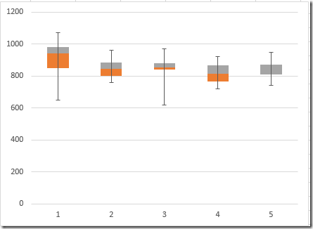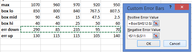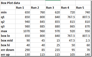 If we create an auxiliary data containing this data and follow my advice from my Error Bars in Excel post, we can create a nice looking box plot.