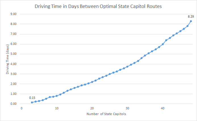 An interesting twist is that Randy extends the problem to consider both the driving distance and the number of states visited. If we are willing to do a tour of, say, 10 states, then clearly the total distance for the tour will be much shorter than a 48 state tour. Randy has a nice animation showing tours of differing numbers of states, as well as a chart that plots the number of states visited against the estimated driving time. This curve is called the efficient frontier – you sometimes see similar curves in financial models.