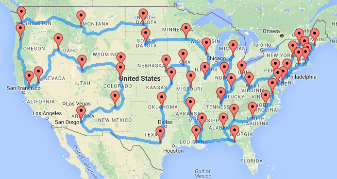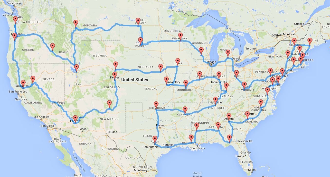 An “optimal road trip” is an ordering of the 48 state capitols that results in the smallest possible driving distance as determined by Google Maps. This is an example of what is known as the Traveling Salesman Problem (TSP). In his work, Randy has made a couple of simplifying assumptions that I will also follow: