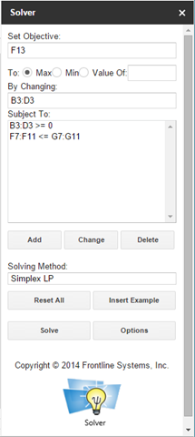 Step 3: Solve. Clicking on Solve will call Frontline’s Simplex solver to solve your model on the cloud (specifically – Windows Azure…). The variables B3:D3 will be updated, as will any formulas that depend on those values. As you can see, profit goes up: