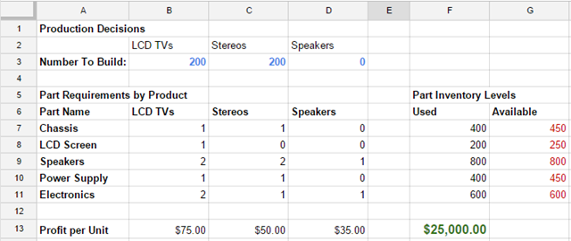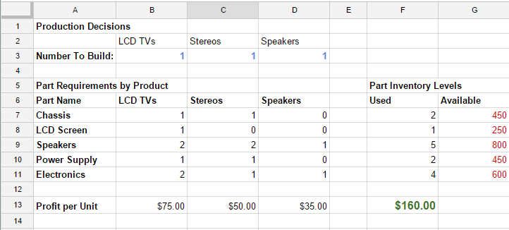 Step 2: Create an optimization model. You can use the task pane to define the variables, objective, and constraints of your optimization model. Clicking on the “Insert Example” button will paste a sample problem into your sheet. Here’s what it looks like: it’s a production planning problem where we want to determine the number of TVs, Stereos, and Speakers to build in order to maximize profit.