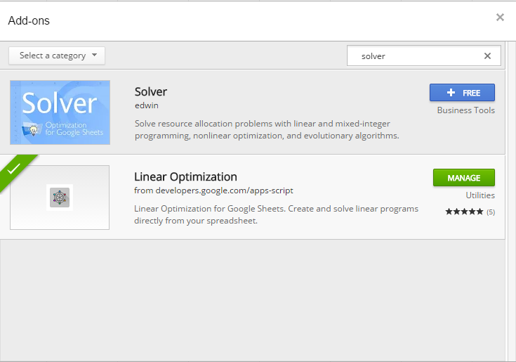 Step 1: Insert the Add-on. Create a new Google Sheet (for example by going to drive.google.com and clicking “New”). Then, under the Add-ons menu, click “Get add-ons..”. Search for “solver” and you will see both the Google and Frontline apps: