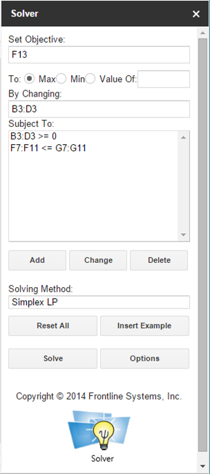 In the task pane on the right you can see that the profit cell (F13) has been selected as the objective we are maximizing. Similar to the Excel solver, you can define the constraints by clicking on them in the “Subject To” section.