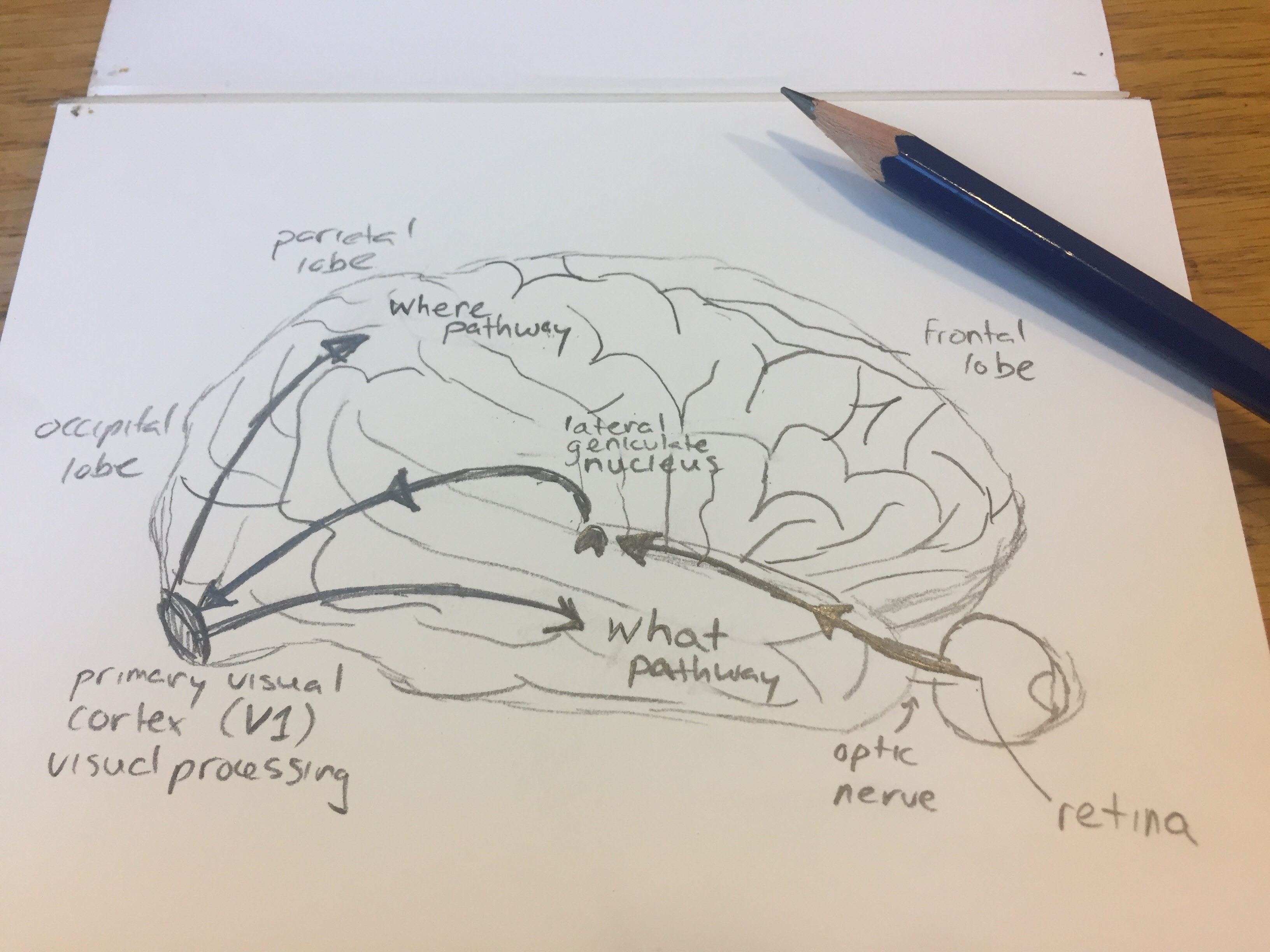 This leads to Kandel's examination of the nature of perception. Perception is more than what comes in from the outside. Perception based on visual input alone is incomplete and ambiguous: we must apply additional context in order to make sense of a flawed, jittery two dimensional projection of objects in a three-dimensional world. Our eyes are not enough. It's long been known that the inverse optics problem can only be solved with additional top-down information (see this Quanta article for more). Top-down information helps me figure out that's not the Statue of Liberty, it's just a plastic ornament on the dash. Chalk drawings sometimes fool us nonetheless: