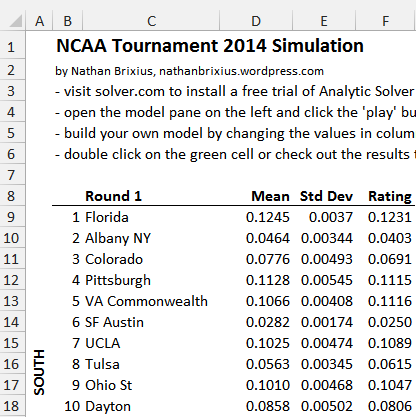 I have created a simulation model in Microsoft Excel using Frontline Systems’ Analytic Solver Platform to predict the 2014 NCAA Tournament using the technique I described in my previous post.