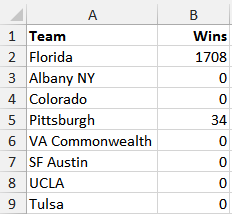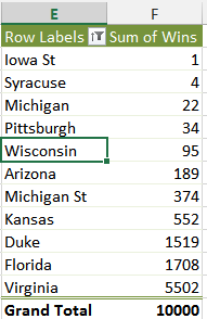 Now move over to the Results worksheet. In columns A and B you see the number of times each team won the simulated tournament (the sum of column B adds up to 10,000):