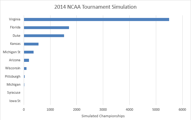 We see that even though Virginia is predicted to be the most likely winner, Florida and Duke are also frequent winners.