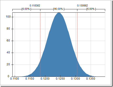 The peak of the bell curve (normal) distribution is at 0.1245, the rating calculated in my previous post. Analytic Solver Platform samples different values from this distribution (and the other 63 teams), producing slightly different ratings, over and over again. As the ratings jiggle around for different trials, different teams win games and there are different champions for these simulated tournaments. In fact, if you hit F9 (or the “Calculate Now” button in the ribbon), you can see that all of the ratings change and the NCAA champion in cell Y14 sometimes changes from Virginia to Florida to Duke and so on.