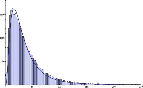 Show[Histogram[Select[sentLengths, # < 250 &]], Plot[ratio*PDF[LogNormalDistribution[m, s] /. lnp, x], {x, 0, 250.}, PlotStyle -> Thick, PlotRange -> All]]