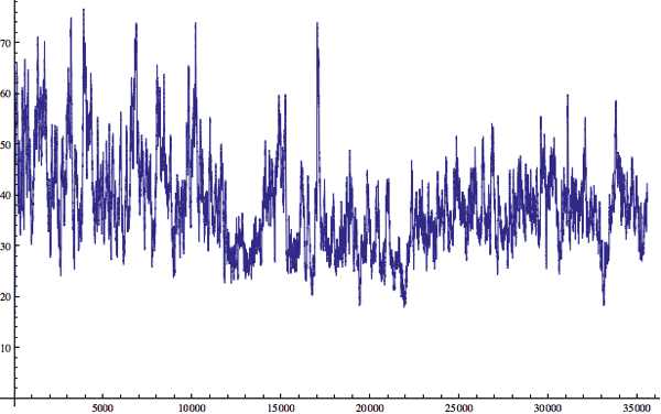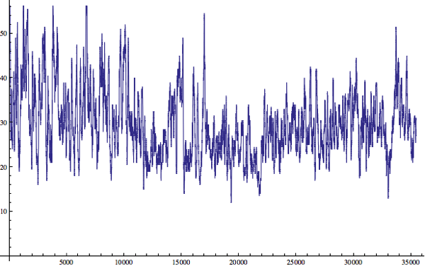 Finally, I wanted to see whether there were significant changes in average sentence length as we progress through the story. Can we identify trends? To try to examine this, I used the ExponentialMovingAverage method. I wasn’t really able to conclude anything substantial. So in the spirit of Stephen Wolfram, here are some pretty pictures.