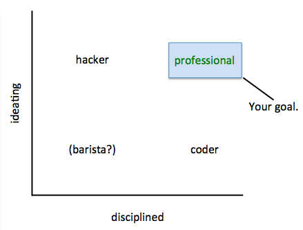 No matter where you work, you want to be a pro – in the upper right hand corner. Engineering discipline and creativity can absolutely coexist – and the traces of both are plainly evident in technology that truly inspires, be it the iPad, the Kinect, or whatever. Engineering discipline is simply more important (in a relative sense) than in smaller organizations, and for sound reasons. Large companies have different considerations. Big companies have big teams working together towards common goals. They all must march and work together. The cost of failure is often higher. Typically the team needs to support a large past body of work, such as a previous version. Mistakes can have consequences that last years. The list goes on.