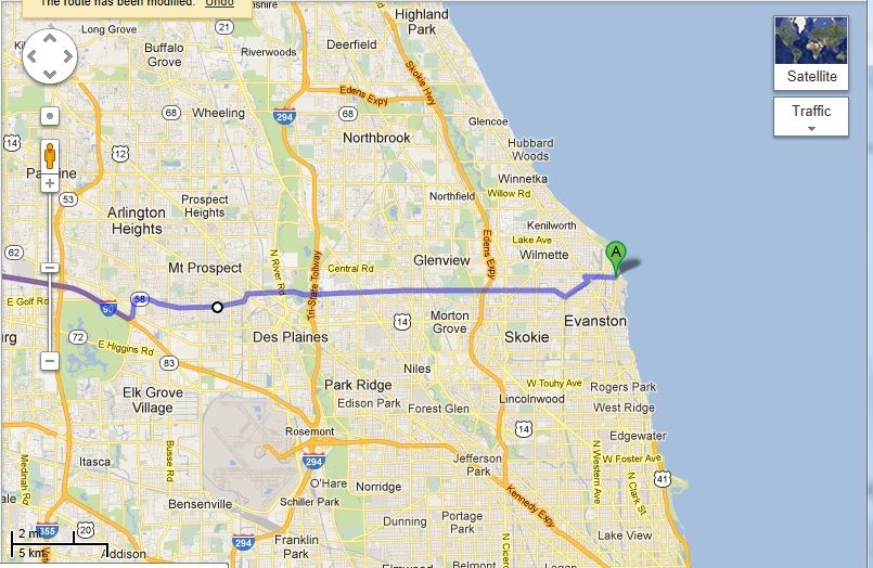 I'm being asked to hop on 94 and hook up with 90 W. (The remaining steps are left as an exercise for the reader.) Now it turns out that if avoid 94 and take Golf Road, the estimated time is 5 hours 5 minutes (4 more minutes):